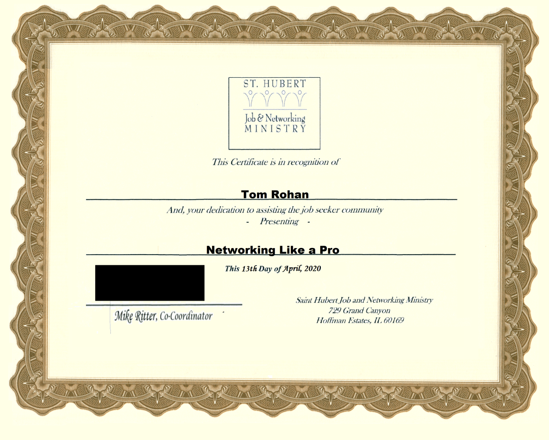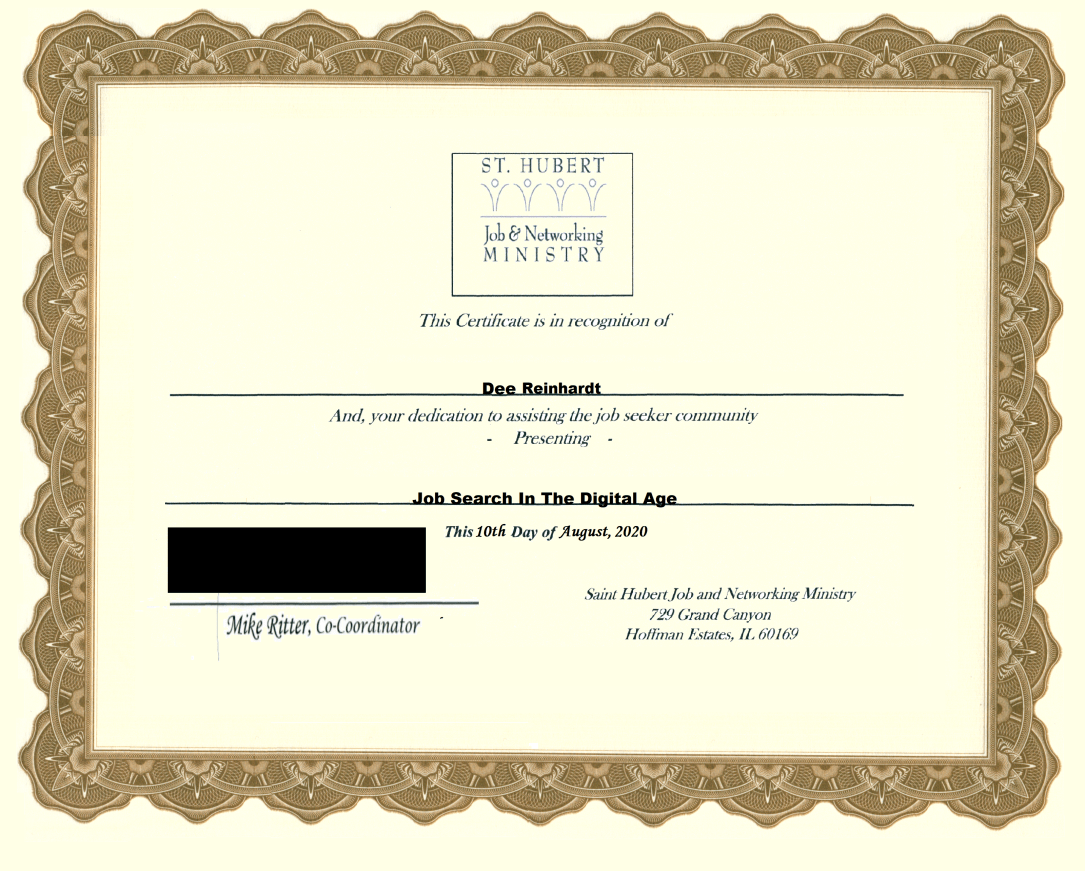 Tiffany Rose Creative Media LLC created these “virtual” certificates for the St. Hubert Job & Networking Ministry (Hoffman Estates, Illinois).