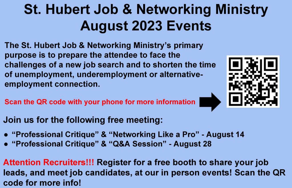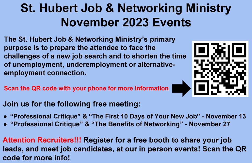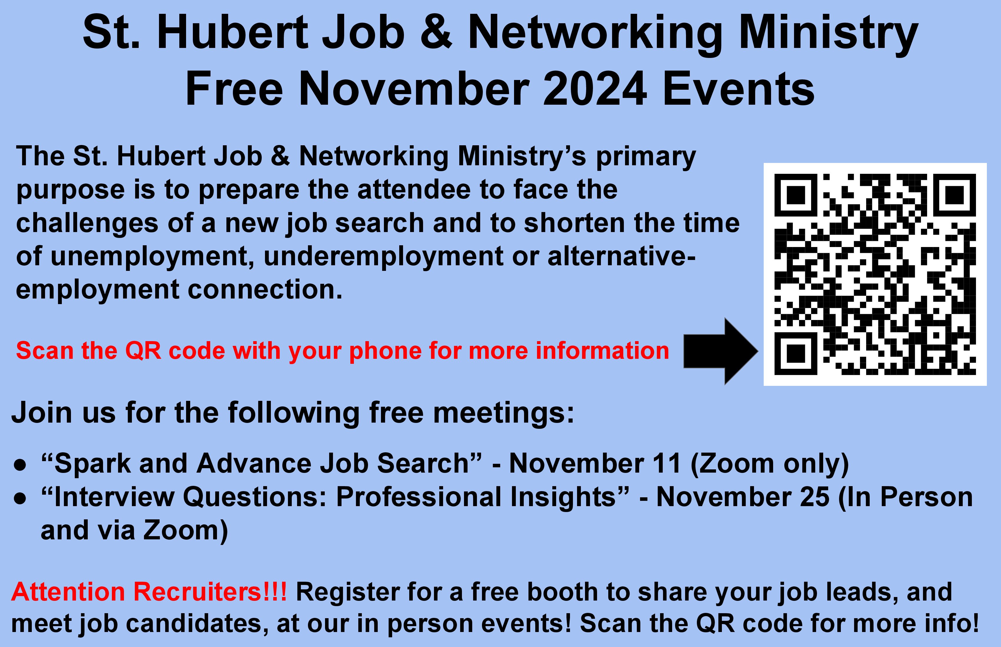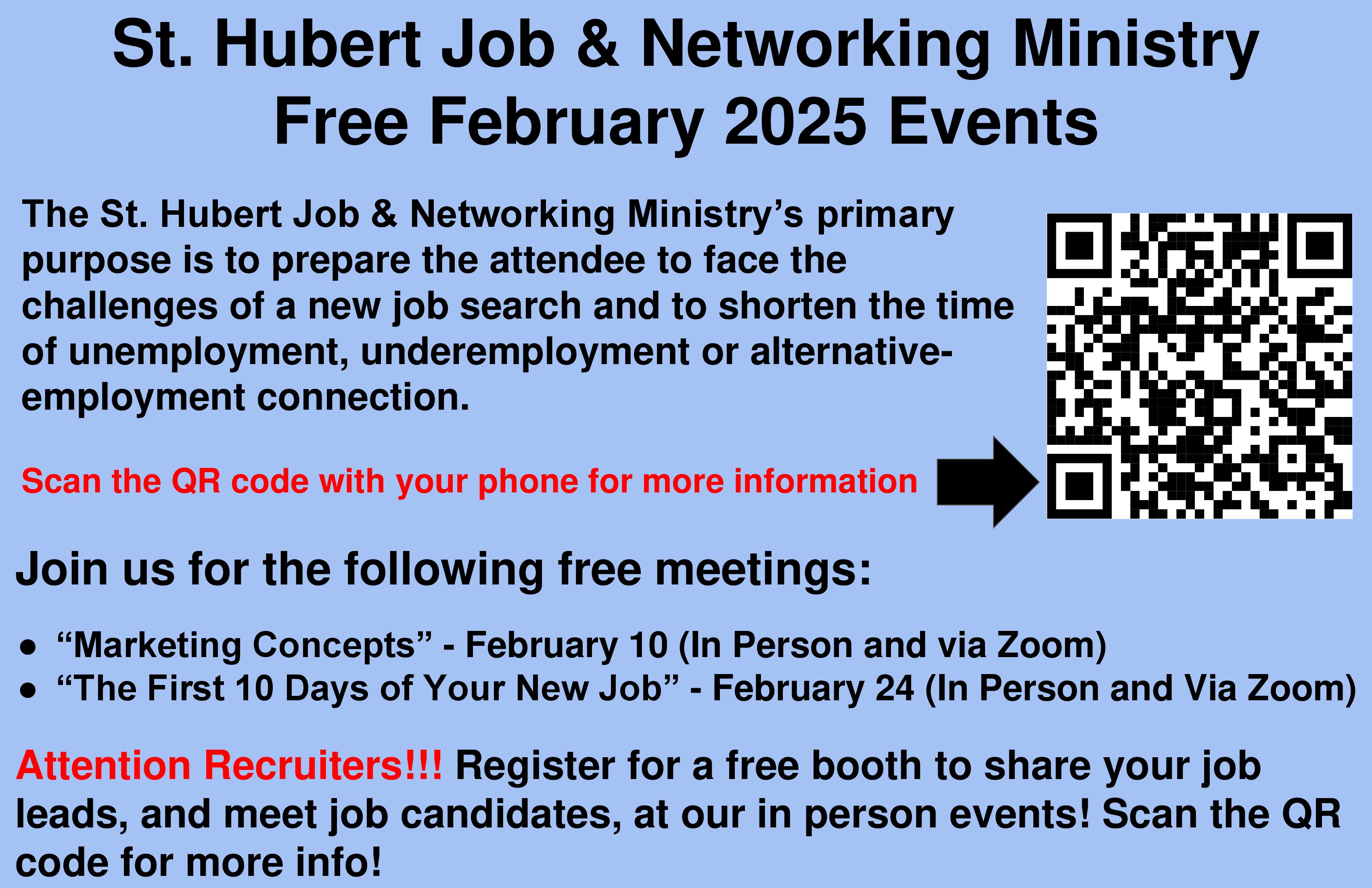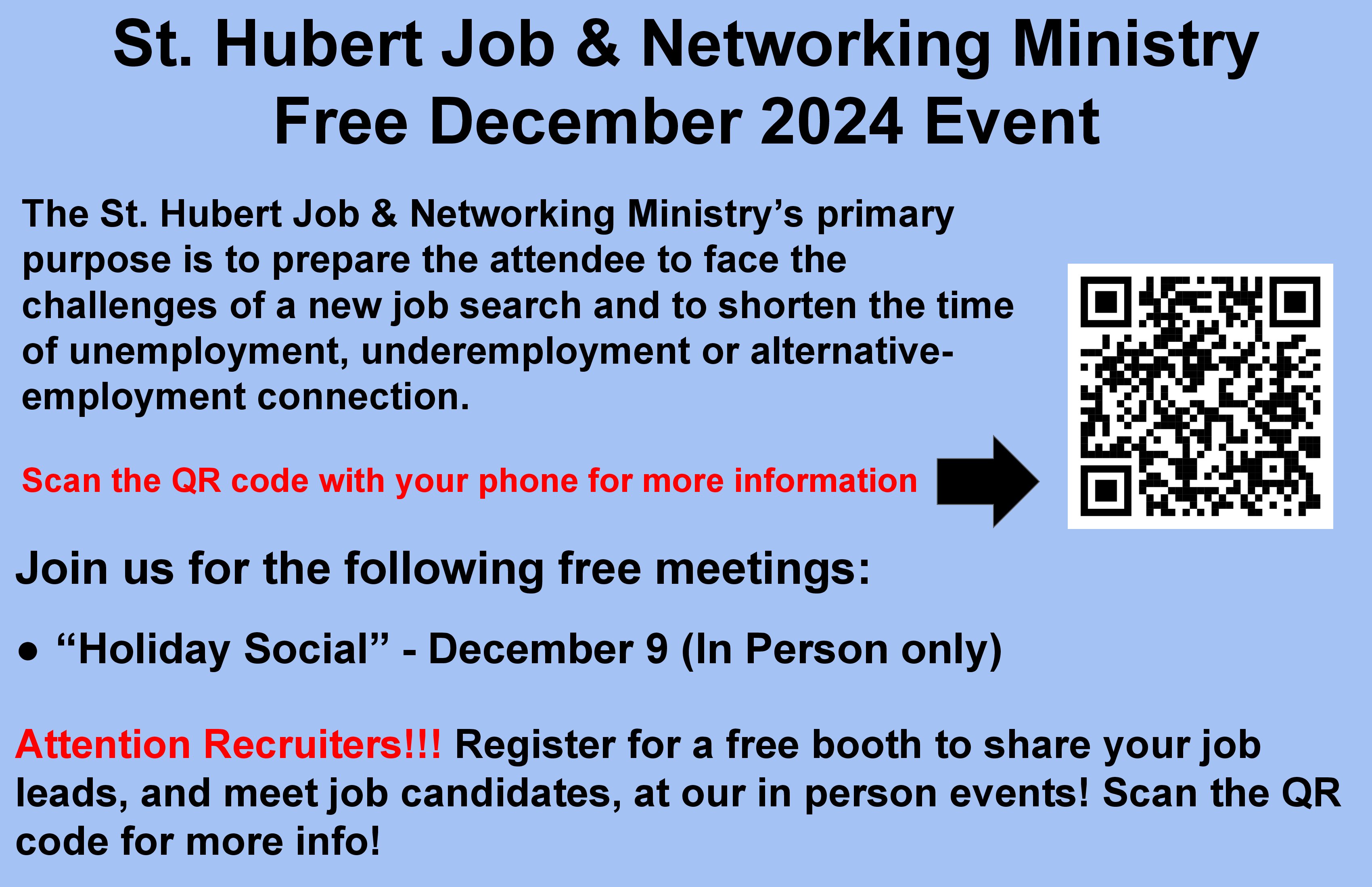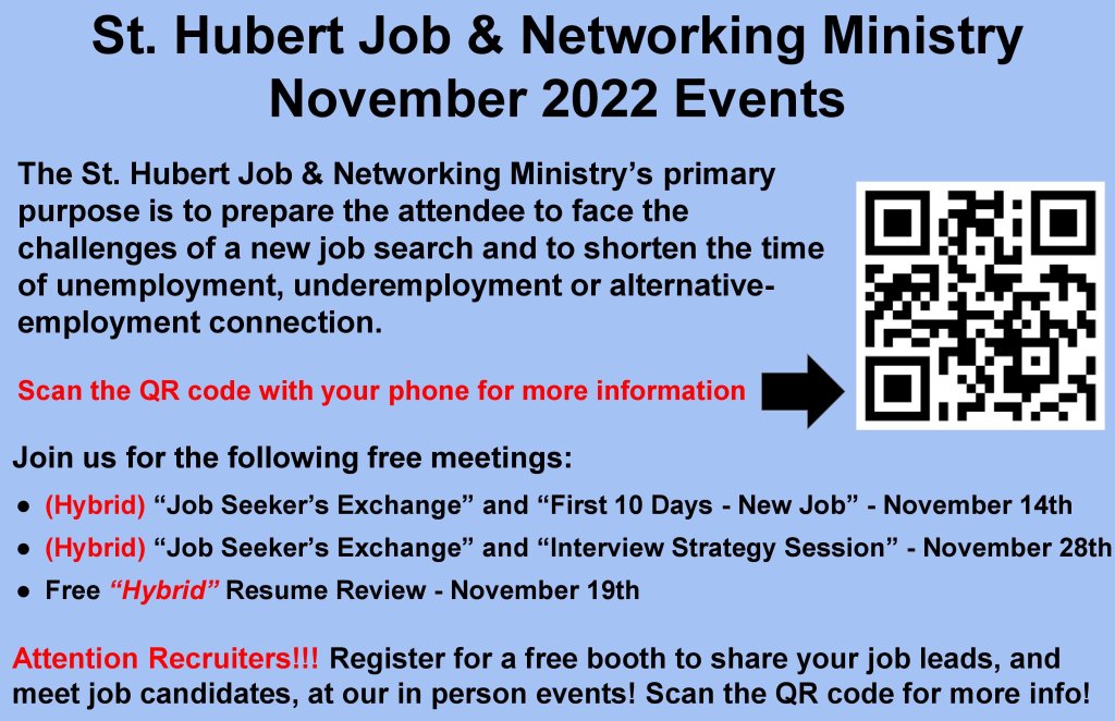 The St. Hubert Job & Networking Ministry’s mission is to prepare job seekers to face the challenges of a new job search, and to minimize intervals of unemployment, underemployment or alternative-employment. This mission is accomplished through the employment of practical job techniques, strategic employment tools and classic networking in a faith-based setting. These employment tools provide insight into attendees’ targeted career pursuits, and also provide techniques to overcome barriers inherent to those seeking employment.