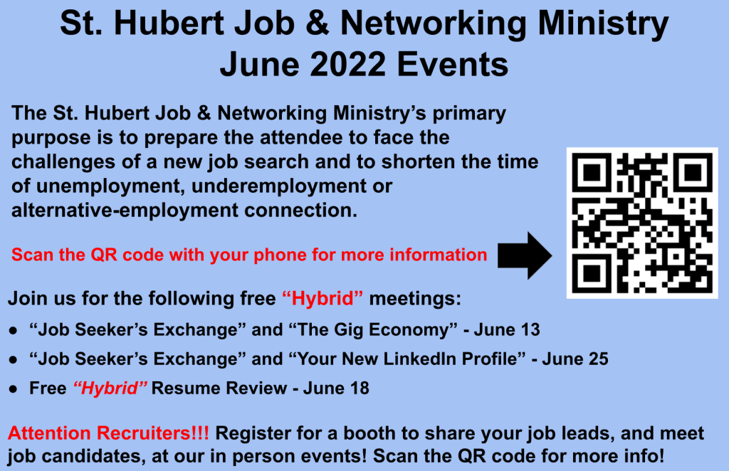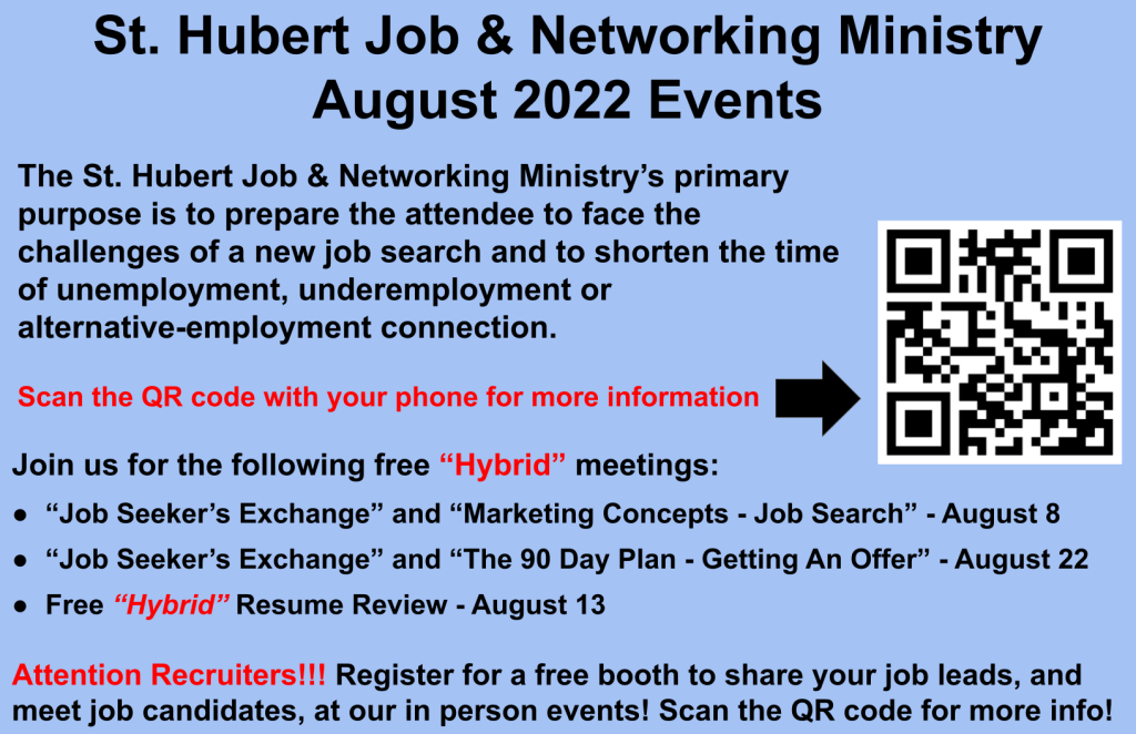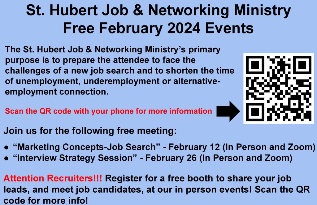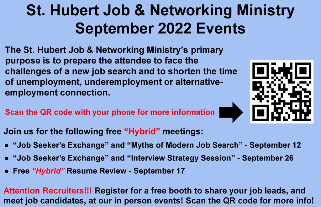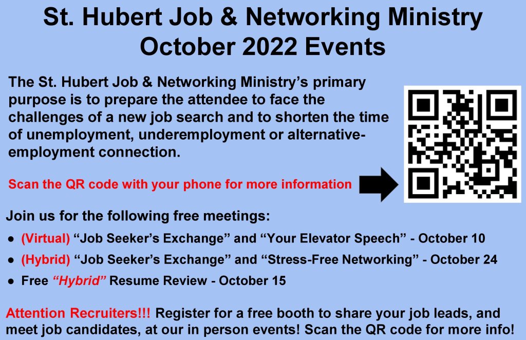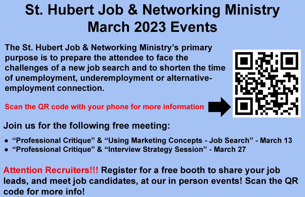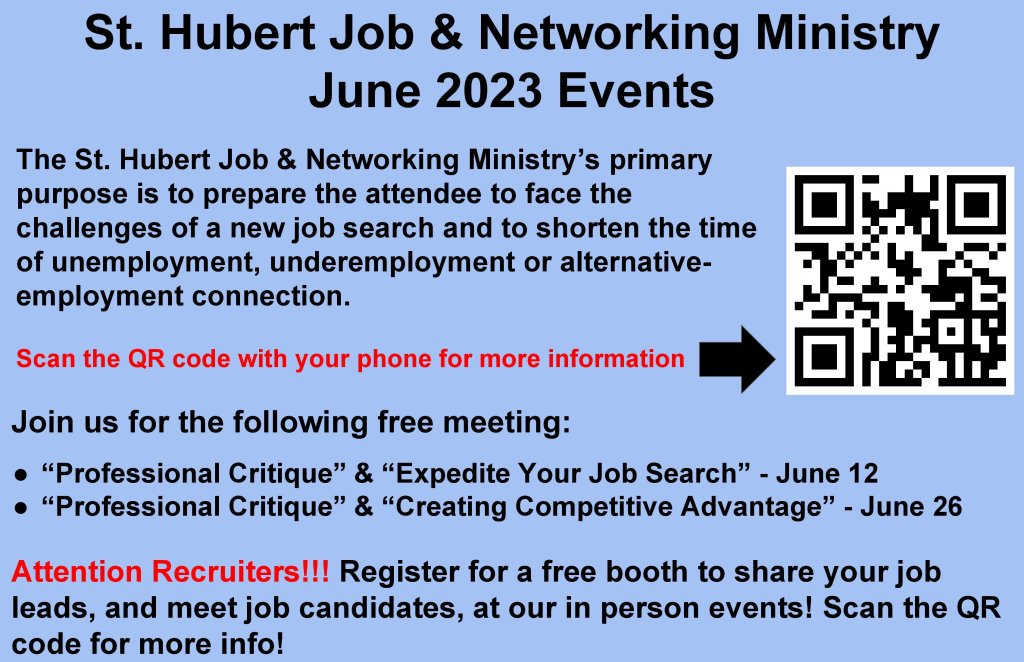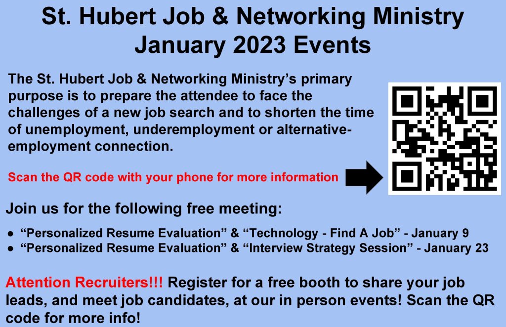 The St. Hubert Job & Networking Ministry’s mission is to prepare job seekers to face the challenges of a new job search, and to minimize intervals of unemployment, underemployment or alternative-employment. This mission is accomplished through the employment of practical job techniques, strategic employment tools and classic networking in a faith-based setting. These employment tools provide insight into attendees’ targeted career pursuits, and also provide techniques to overcome barriers inherent to those seeking employment.