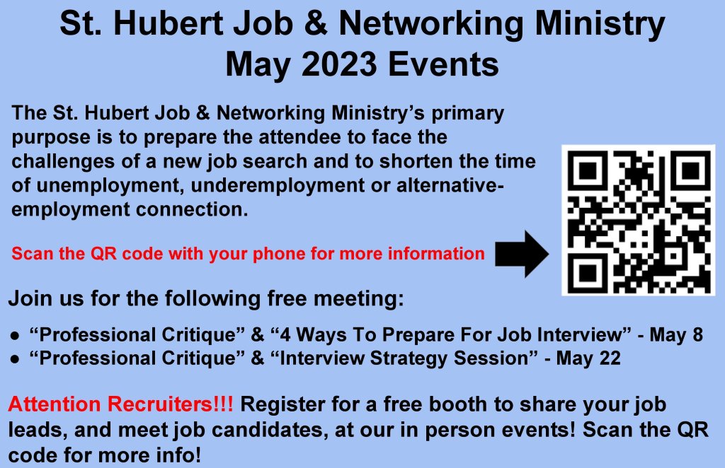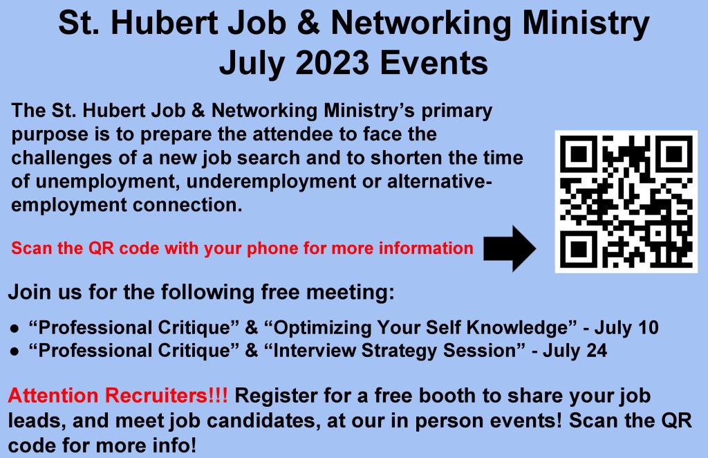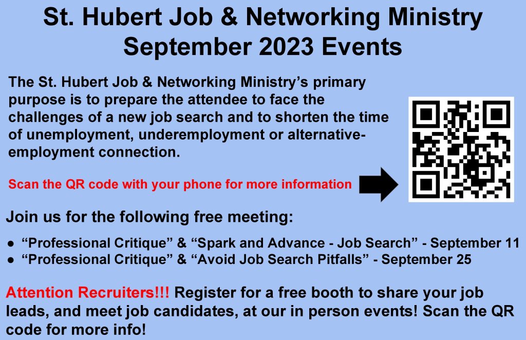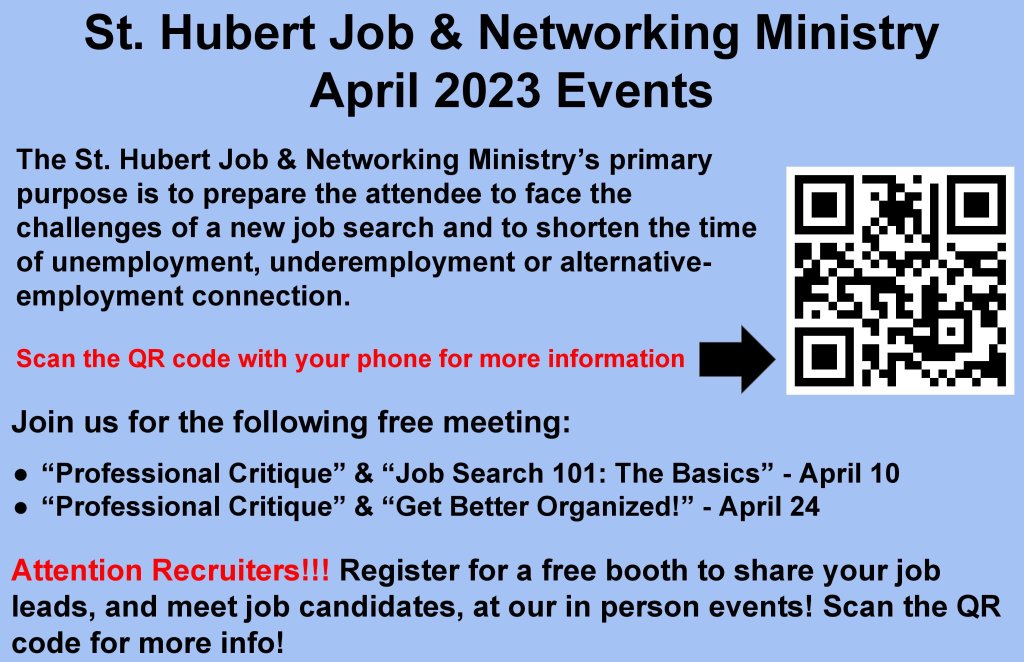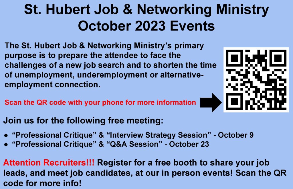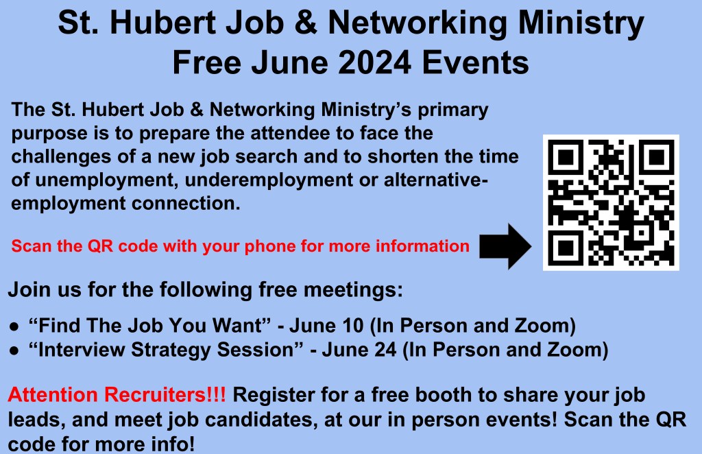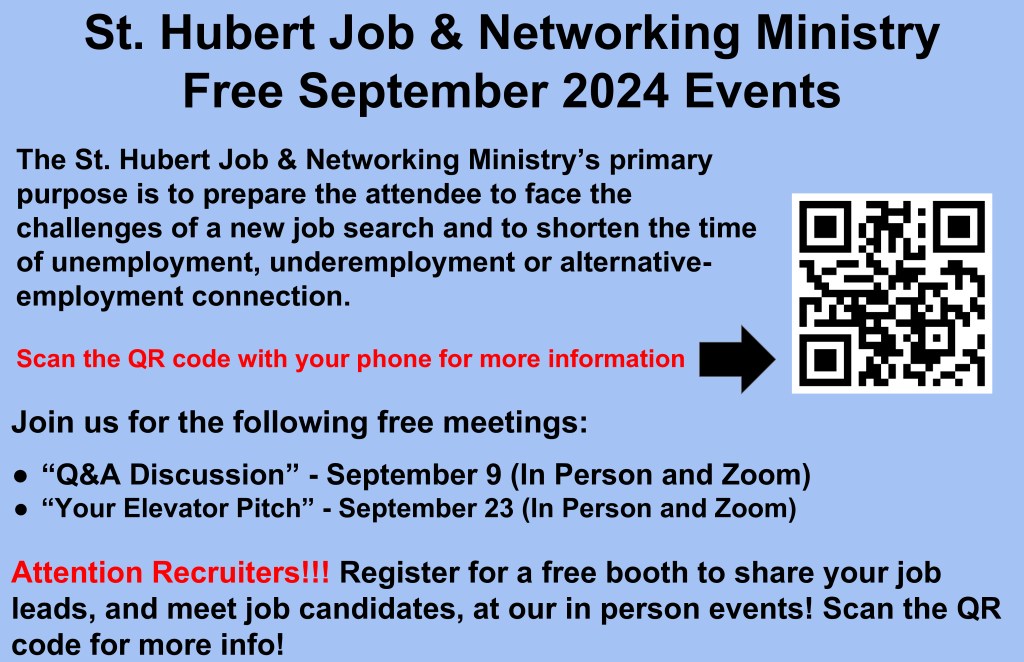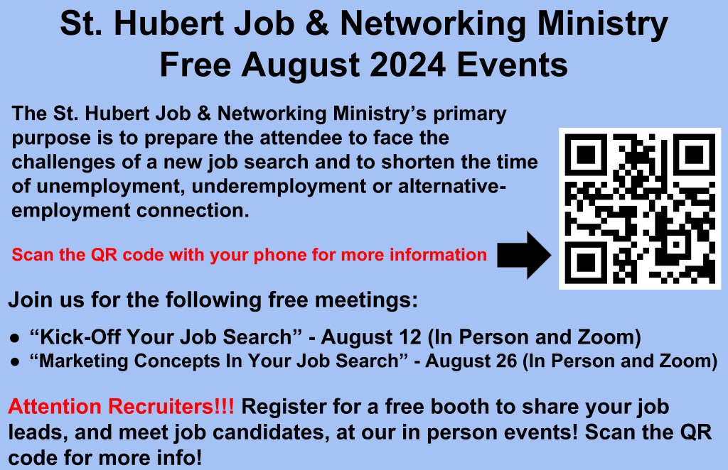 The St. Hubert Job & Networking Ministry’s mission is to prepare job seekers to face the challenges of a new job search, and to minimize intervals of unemployment, underemployment or alternative-employment. This mission is accomplished through the employment of practical job techniques, strategic employment tools and classic networking in a faith-based setting. These employment tools provide insight into attendees’ targeted career pursuits, and also provide techniques to overcome barriers inherent to those seeking employment.