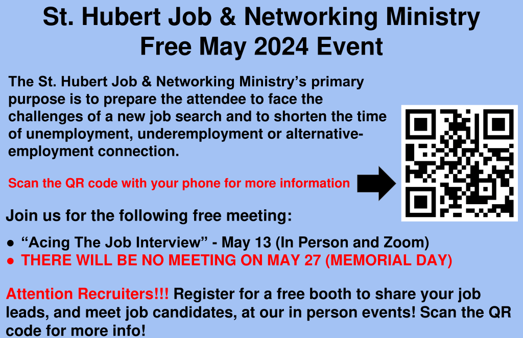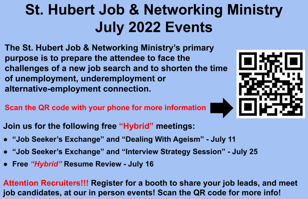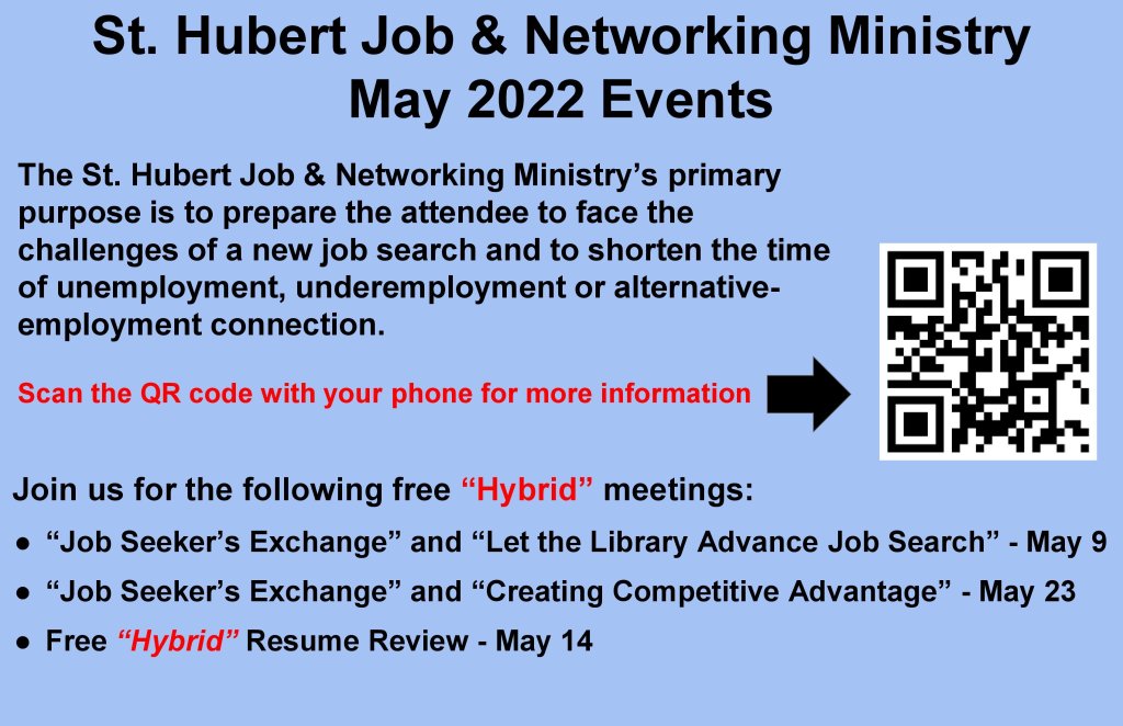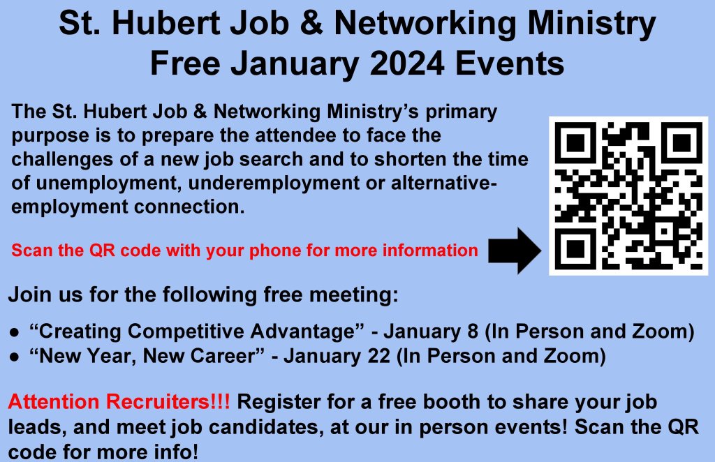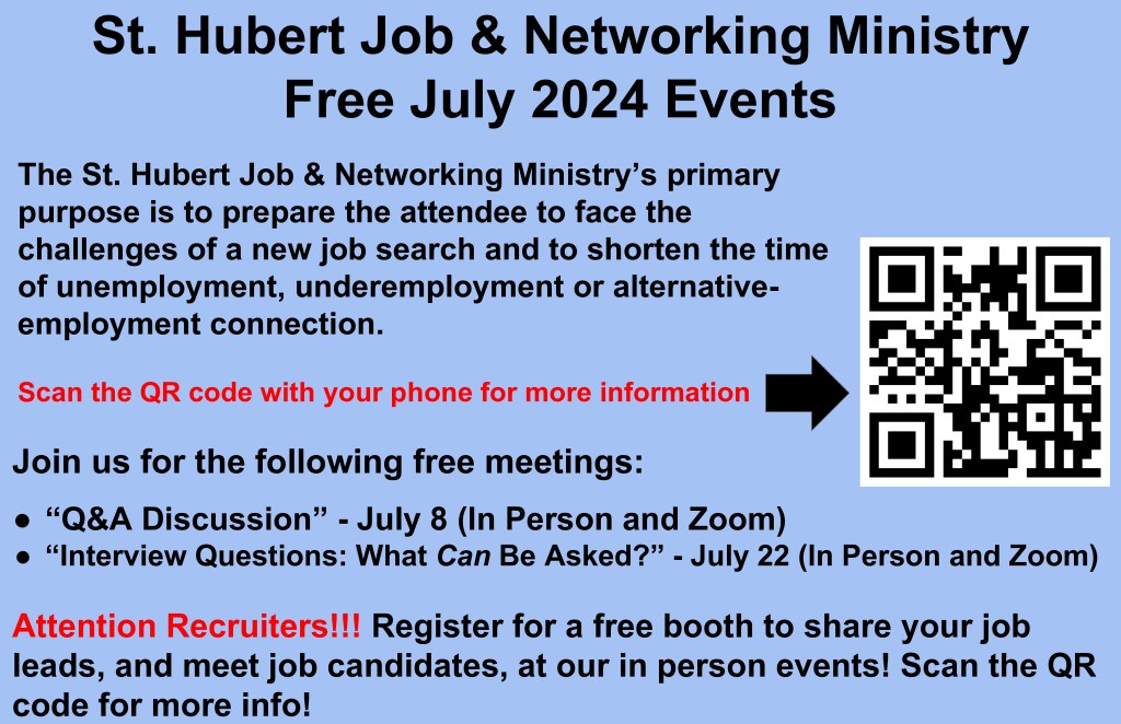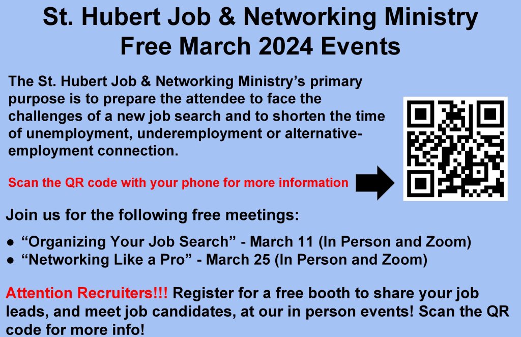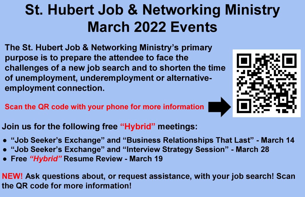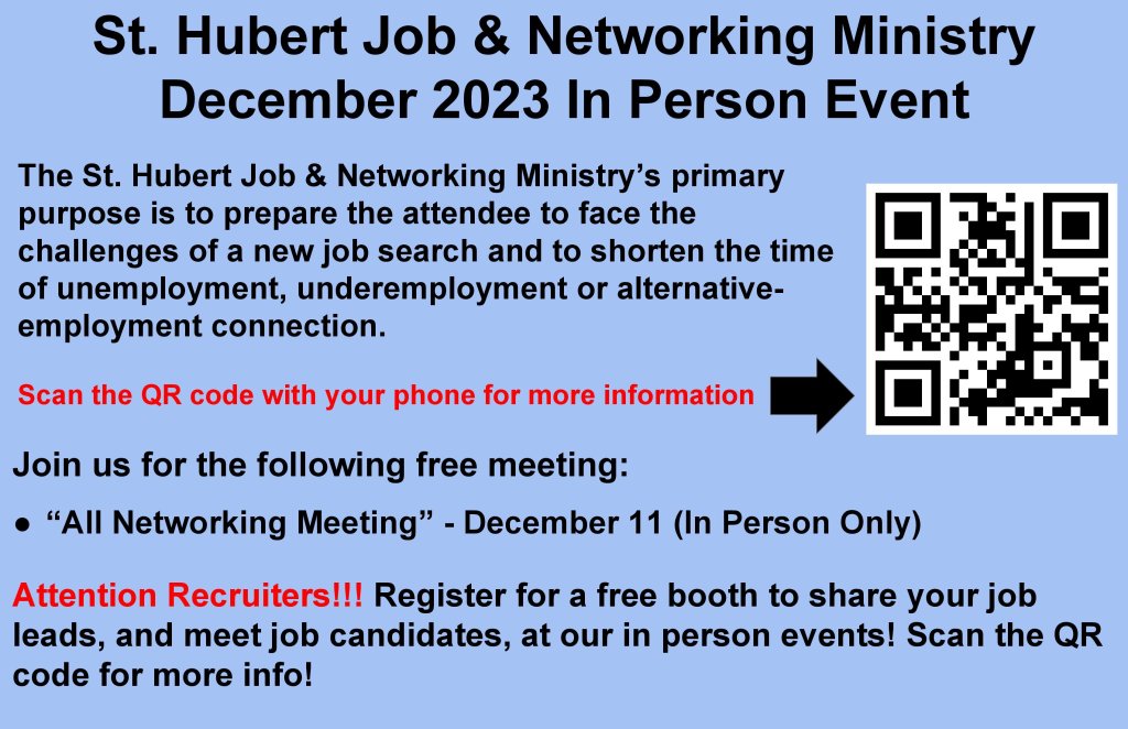 The St. Hubert Job & Networking Ministry’s mission is to prepare job seekers to face the challenges of a new job search, and to minimize intervals of unemployment, underemployment or alternative-employment. This mission is accomplished through the employment of practical job techniques, strategic employment tools and classic networking in a faith-based setting. These employment tools provide insight into attendees’ targeted career pursuits, and also provide techniques to overcome barriers inherent to those seeking employment.