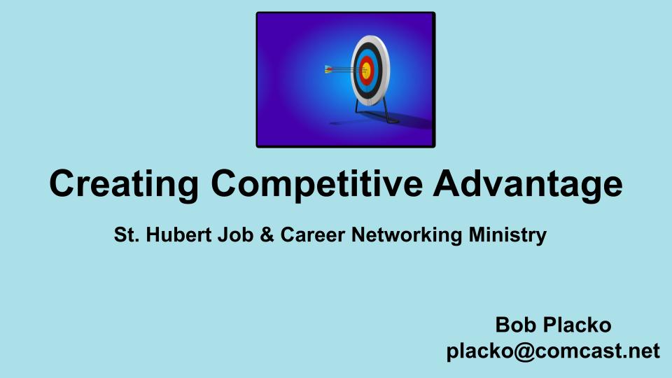 Tiffany Rose Creative Media LLC created this PowerPoint presentation for Bob Placko’s presentation, “Creating Competitive Advantage In Your Job Search”, at the St. Hubert Job & Networking Ministry on August 23, 2021.