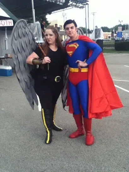 “I actually…put [my costume] together for a charity event, because I needed a recognizable superheroine…and there aren’t many. I do love Black Widow,” said Kelly Guentner, “For Heroes Alliance…the specific charity event…we had an Autism Walk that we participated in.” “[My costume] is based off the Avengers movie. I’ve always been into speedsters…the Flash and Quicksilver [have] been my favorites. When my wife is going to come as Black Widow, when we had another Scarlet Witch, and an Iron Man…it’s like, ‘Let’s throw it together…Quicksilver it is,” said Thomas Guentner. “[Scarlet Witch has] always been one of my favorites, probably because of her powers,” said Funk. “I am Iron Man. The suit is a high-tech prosthesis, and it’s really entertaining for people. [People] recognize him pretty easily…[the] light-up chest,” said Krall. “This year, just like last year, when I did a makeshift ‘Man of Steel,’ I wasn’t too happy with it. So…for this year, I still wanted to do the ‘Man of Steel,’ but I wanted to up my game. I always try to do a better costume…see…test your limits. You never know how [well] you’re going to do unless you test your limits. So, I found [that] I could easily [find] a deluxe cape, move the logo from the cape to the suit, and the cape, by itself, even with just the plain red set…I think it looks really good. I’m very happy it worked out this year,” said Charlee Soffer (Chartrand), who portrayed Superboy, and “…first found out [from the first year], about the Fest…they didn’t have a Superman. So, I emailed Jim [Martens], and said, ‘I heard you guys don’t have [a Superman]. Do you need one? Do you already have one in mind?’ They said, ‘No one’s stepped up yet,’ and the rest is history.” “When we were in Metropolis, we were all doing a photo shoot, we were doing the movie, ‘Grease’…we had…Clark Kent, Green Arrow, Hawkman, and so forth… all dressed up in leather jackets, but some version of their character….a ‘Greaser’ version…and one of our friends that was there…a couple…they both had these Hawkman wings, and the woman had the Hawkgirl wings. They told me that they were selling a pair of the wings, that she was wearing, [because] they had made an extra set. They make these…I bought [them], right there, and so I wore them in Metropolis, just kind of wearing [them] around, just to see how they’d do…it wasn’t like I had a character in mind, and then I had to get wings. I thought the wings were so cool…[they spread out]…they move. I thought the wings were so cool…I’ve [got to] figure out which character to be…[there are] two characters that I realized that I had enough stuff for…[throwing] some things together to come down [to Plano], that I didn’t have a lot of [preparation] time, so [I put together] some stuff for Hawkgirl and some stuff for Angel,” said Egan.