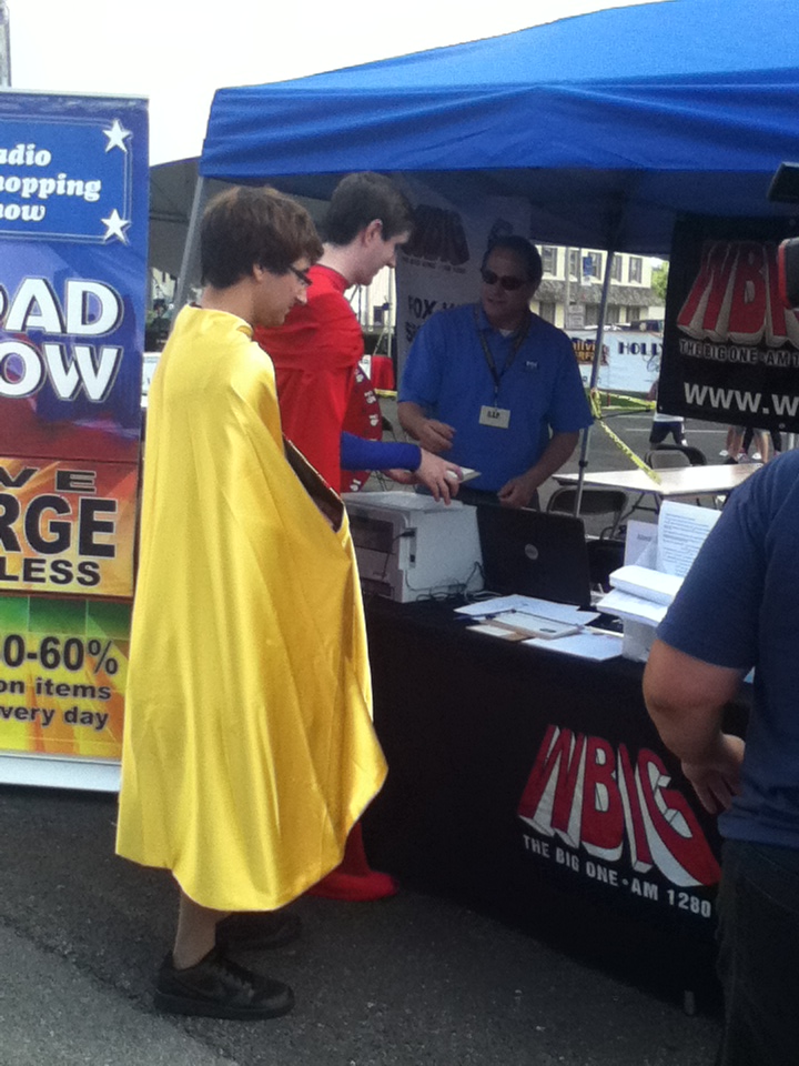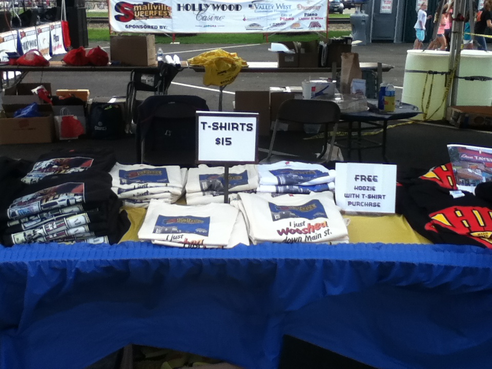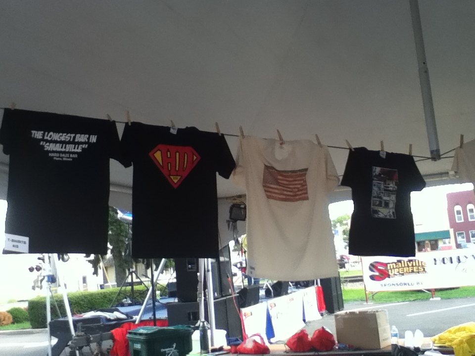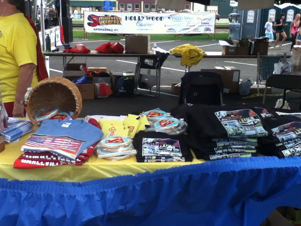Smallville SuperFest featured bands Jody Upp, Friends of Fife, The Brothers of Absolution, Ryan Mumby, Mr. Johnson, Blue Shield, Reason to Believe, and Orion Nine. It also featured food vendors, including Frank Michaels, who inquired about doing the event, and said that he would love to be part of Smallville SuperFest in the future, “If they keep having it, absolutely, we’ll be part of it. I hope this festival keeps on getting better, and better, and better…Sue Aurmour…did a superb job,” said Michaels. Chris Johnson, a t-shirt vendor, said that he loves Superman’s appeal as the “All-American Person.” He became a Superman fan by “…having the movie shot here, and getting to watch it be filmed, and getting to be part of it.”