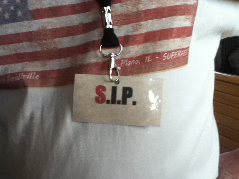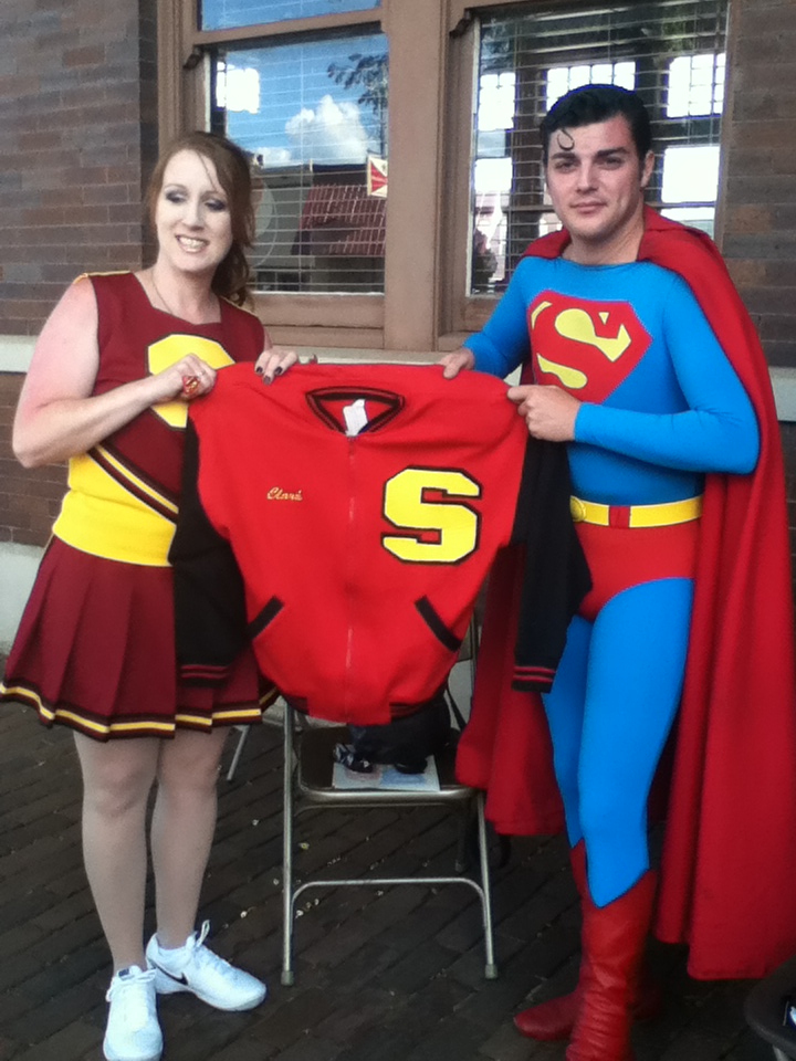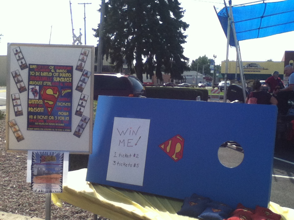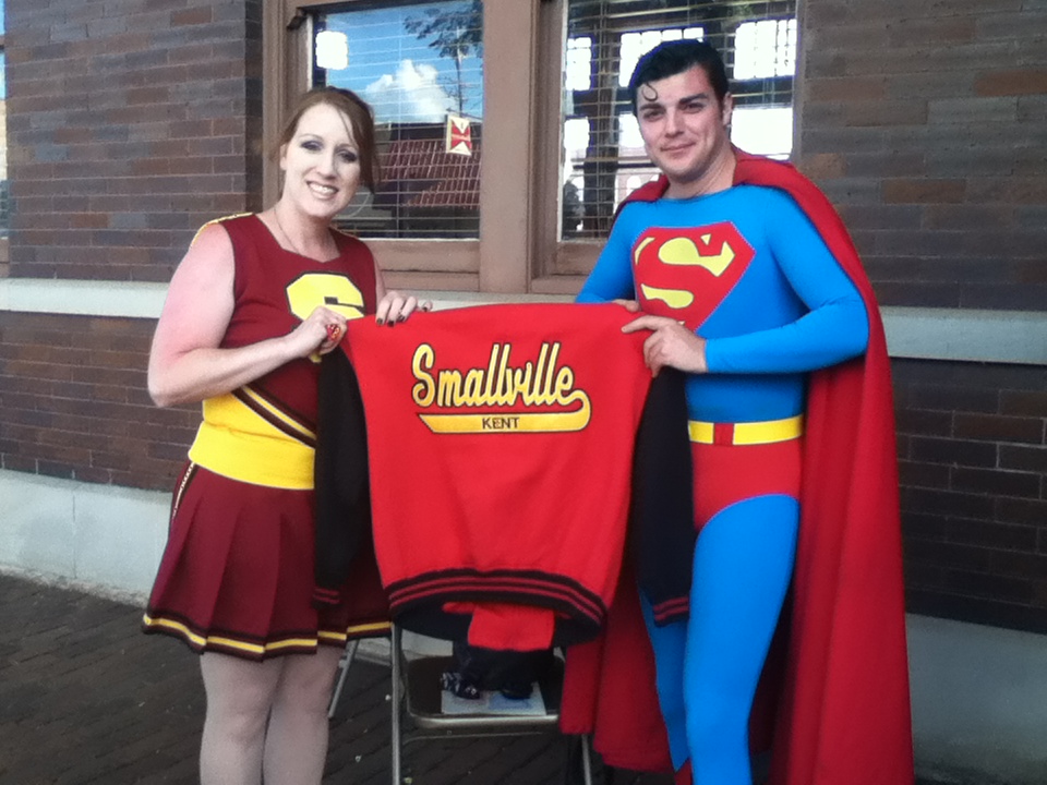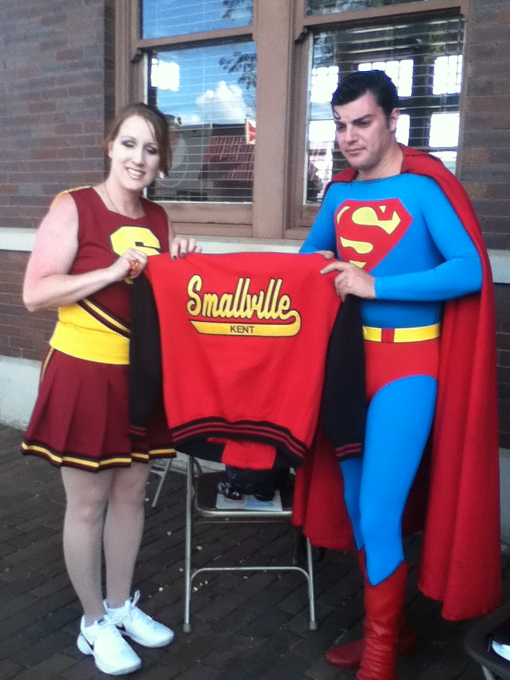 By September of 2011, ideas for planning Smallville SuperFest began to surface. “On Facebook. We had a Facebook conference, and Bob [Hausler] was talking about coming up with the name for it. We all voted on it,” said Brad Gardner, who volunteered to be the Logo and Graphics Coordinator. Within a matter of weeks, about twenty people voted for a logo, out of ten that were proposed. Gardner explained the inspiration for the logo, “[It] jumps off of the page with that shadowing on it. Kind of a comic book-inspired thing. The very townscape…it looks like the city. I went and took a photograph of the downtown, and then copied it, with the water tower in the back, because I think the water tower is going to have something to do with the movie. That‘s just Smallville, USA. Old-fashioned downtown.” “I printed up the signs and designed the banners and all the stuff…posters,” said Gardner.